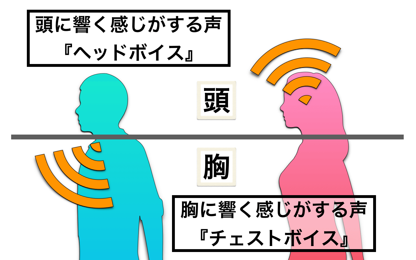 この共鳴感覚を上下に分けたものが『チェストボイス』『ヘッドボイス』ということです。